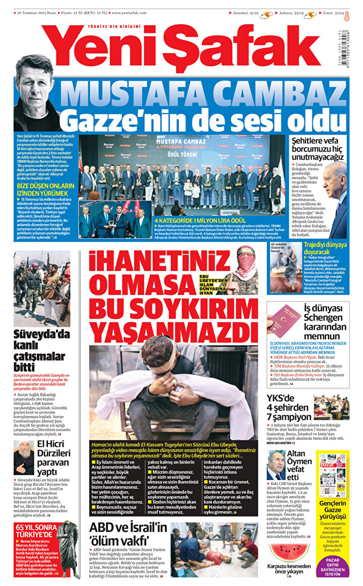 Yeni Şafak Gazetesi'nin 20 Temmuz 2025 tarihli birinci sayfasında yer alan manşet ve haberler...