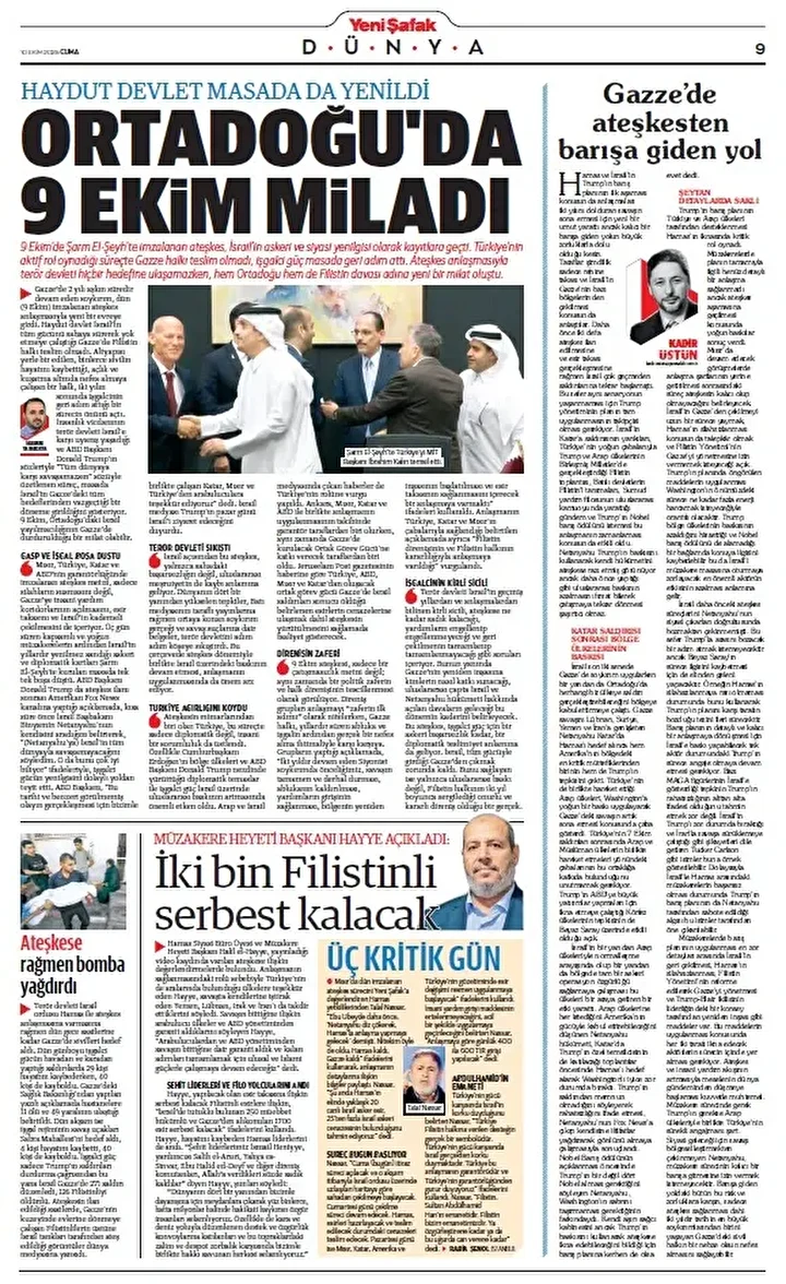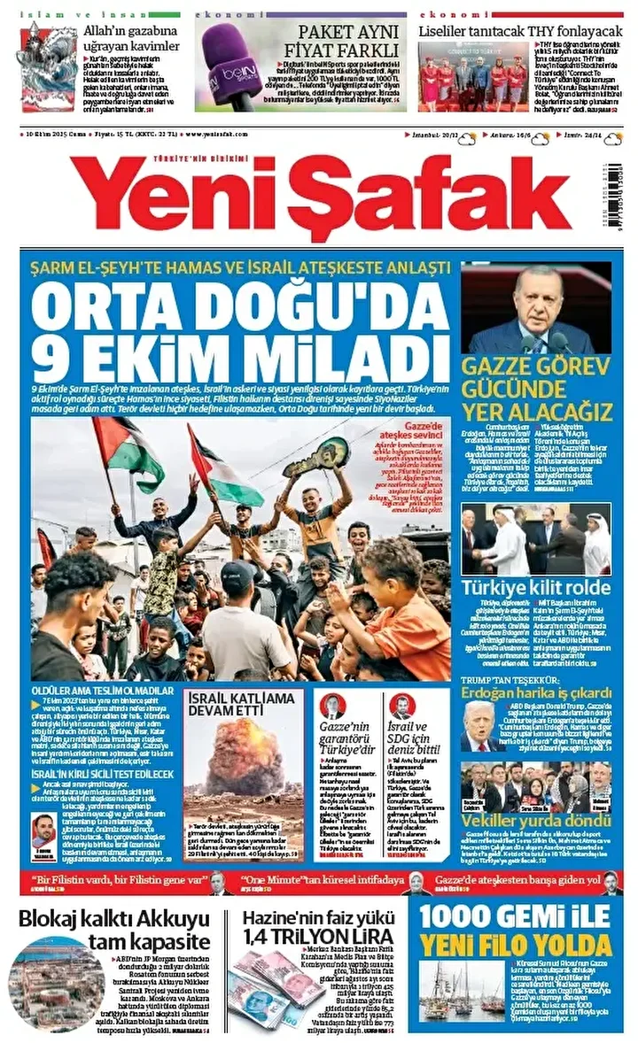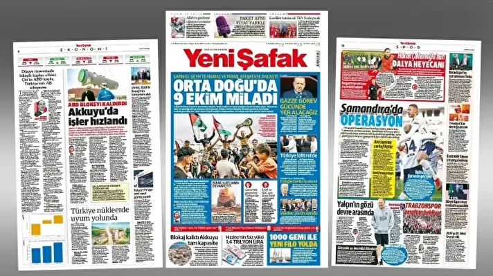 Yeni Şafak Gazetesi'nin 10 Ekim 2025 tarihli birinci sayfasında yer alan manşet ve haberler...