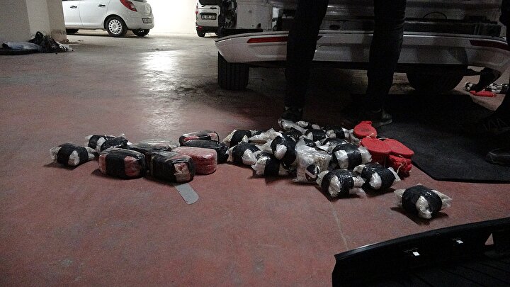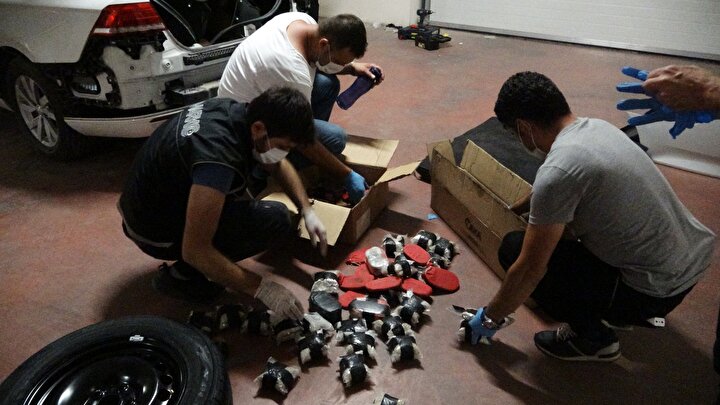 Fırtına'nın tepki gösterdiği otomobilin motor kaputu, arka tamponu, torpidosu ve çeşitli yerlerinde özel bölmelere gizlenmiş yaklaşık 100 bin captagon hap ve 12 kilogram plaka esrar bulundu.