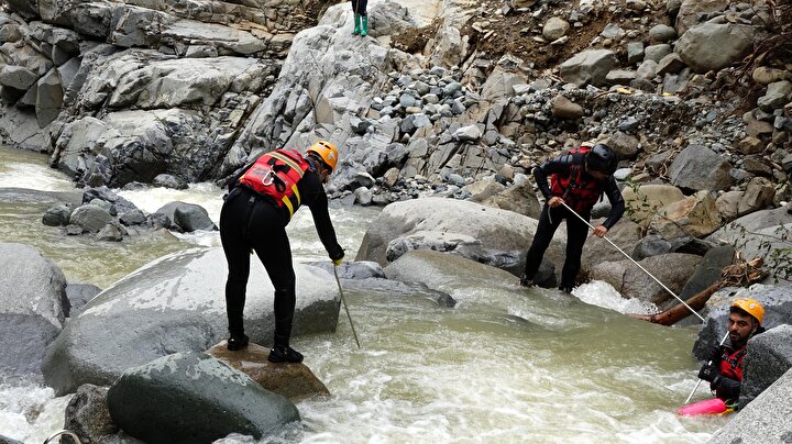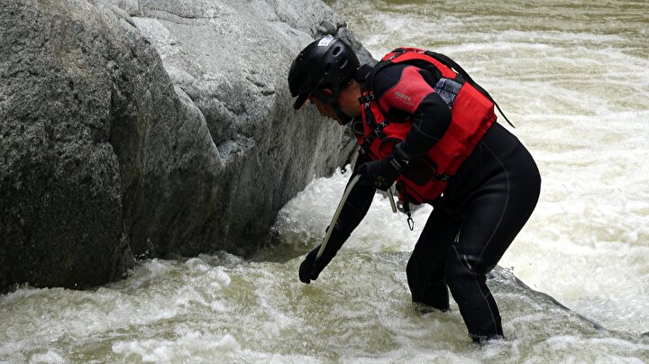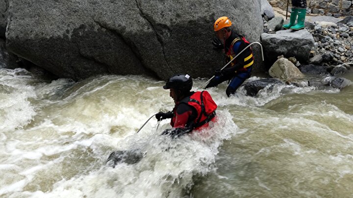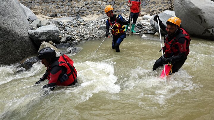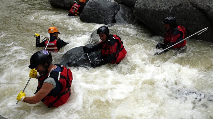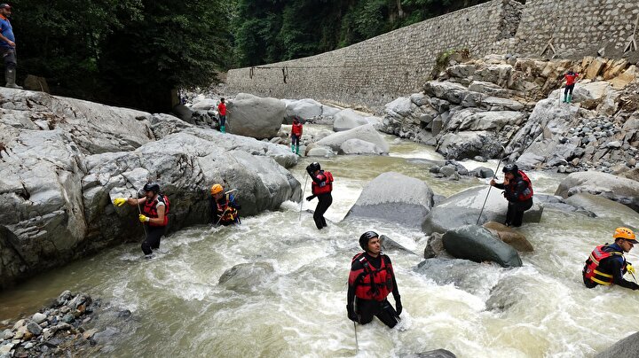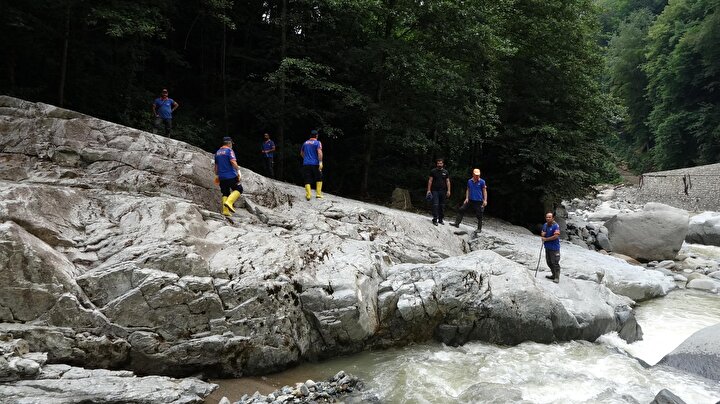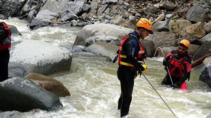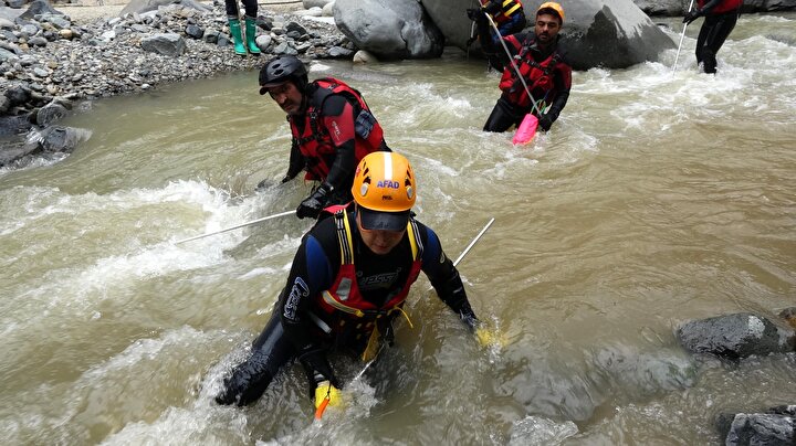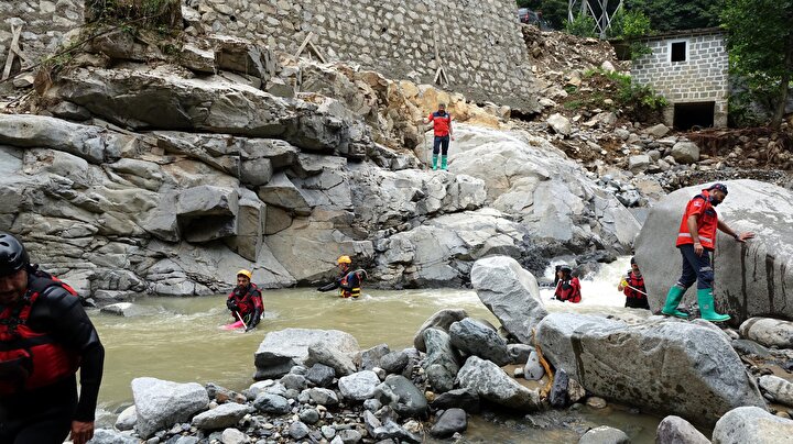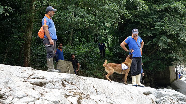 Güneysu ilçesi Ballı Dere’de Erzurum, Samsun ve Balıkesir’den takviye gelen AFAD ekipleri, dere yatağında zor şartlarda aramalarını sürdürüyor. Dalgıçlar, yer yer insan boyunu aşan derede, akıntına rağmen her taşın altını didik didik arıyor. Ekipler, iz takip köpeklerinin de eşlik ettiği çalışmalarla bölgede kayıplara dair ize ulaşmaya çalışıyor.