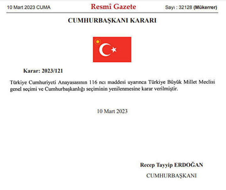 Merakla beklenen 2023 seçimleri için geri sayım başladı. Cumhurbaşkanı Recep Tayyip Erdoğan, Türkiye'yi seçime götürecek önemli kararı imzaladı. Türkiye 14 Mayıs Pazar günü cumhurbaşkanını seçmek için sandığa gidecek. Peki, seçimin yenilenmesi kararı alındıktan kaç gün sonra seçim yapılır? Seçim yasalarında yapılan değişiklikler ne zaman uygulanır? Seçim kararı alınmasının ardından YSK'da süreç nasıl işleyecek? Cumhurbaşkanı seçiminde ilk oylamada çoğunluk sağlanamazsa, ikinci oylama ne zaman yapılacak? İşte merak edilen soruların cevapları...