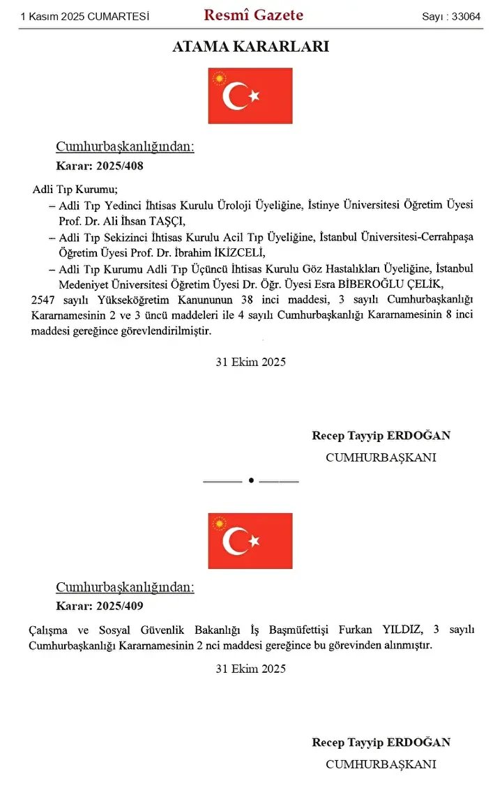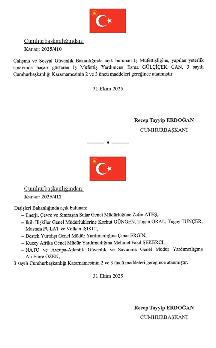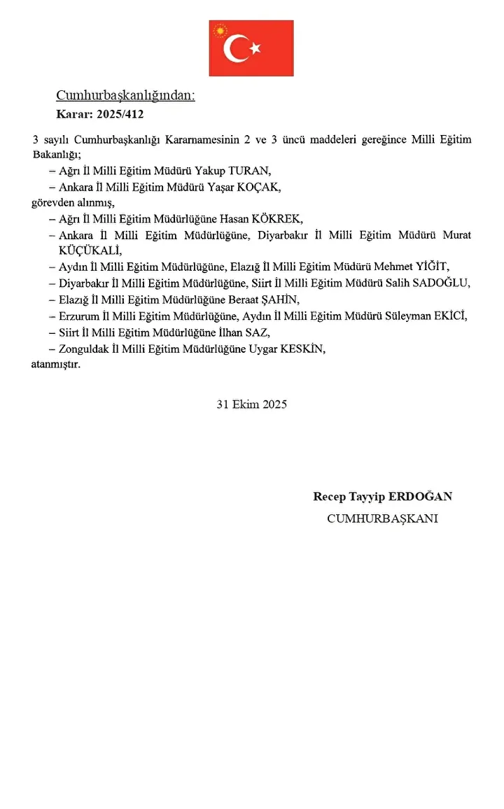 Cumhurbaşkanı Recep Tayyip Erdoğan'ın imzasını taşıyan 1 Kasım 2025 tarihli Resmi Gazete yayımlandı. Buna göre; 8 ilin milli eğitim müdürü değişti, Ankara İl Milli Eğitim Müdürlüğüne Murat Küçükali atandı. İşte günün tüm atama kararları...