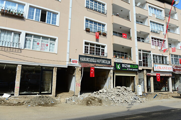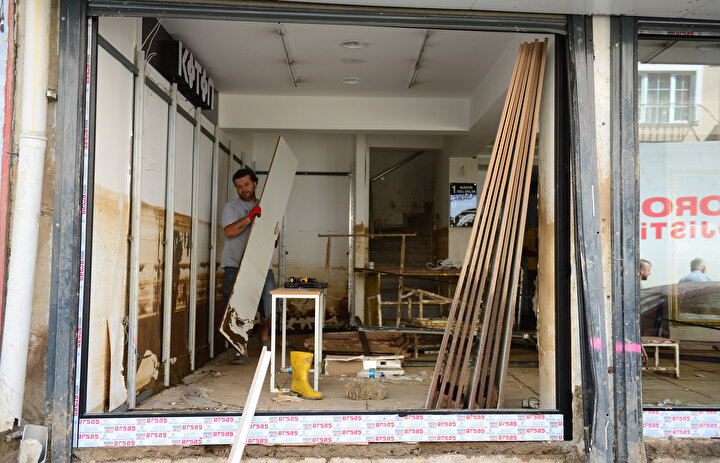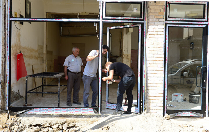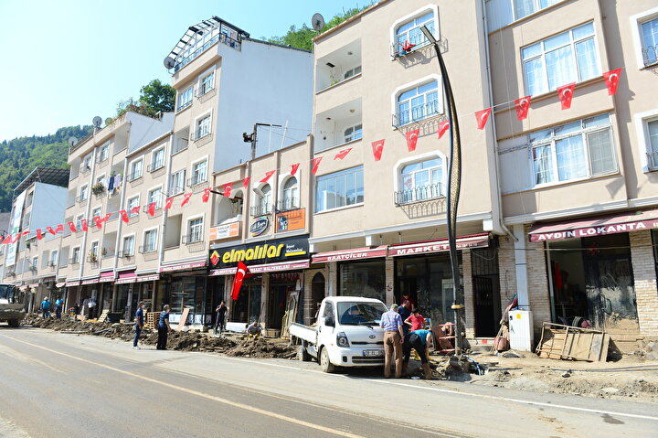 Giresun'da iki hafta önce etkili olan yağışın sele dönüşmesi sonucu ev ve iş yerleri çamur deryasına döndü. 10 kişinin hayatını kaybettiği felaket sonrası büyük bir zarar gören kentte devlet desteğiyle yaralar sarılıyor. Dereli ilçesinde çok sayıda esnaf, iş yerlerinde onarım çalışmalarını yaparak faaliyete geçmek için çaba sarf ediyor. Esnaf Muzaffer Angun, "İş yerimizdeki çamur kısa zamanda temizlendi. Biz de şu anda dükkanın içini tamir ettirmeye çalışıyoruz, faaliyete geçmek için bir an önce içerisini onarmaya gayret gösteriyoruz. Devletin verdiği desteklerden yararlanacağız, 50 bin lira hibeyi inşallah alacağız" dedi. Esnaf Kemal Andiç ise, "Elektrik ve su verildi, işimize başlayacağız. Fırınımızın bakımlarını yapıyoruz, 2-3 günde faaliyete geçeceğiz" ifadelerini kullandı.