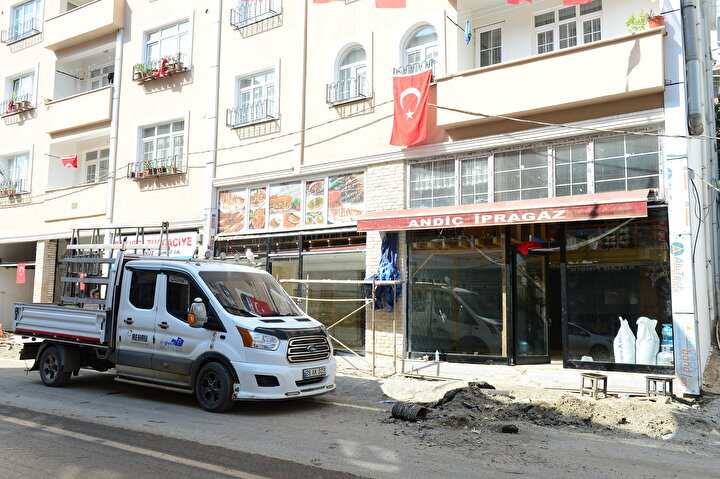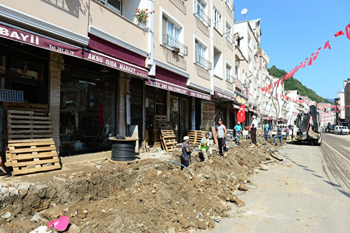 Diğer yandan ise ilçede altyapı çalışmaları sürdürülüyor. Elektrik ve telefon hatları yer altına alınıyor, iş yerlerinin elektrik ve telefon bağlantıları yapılıyor.