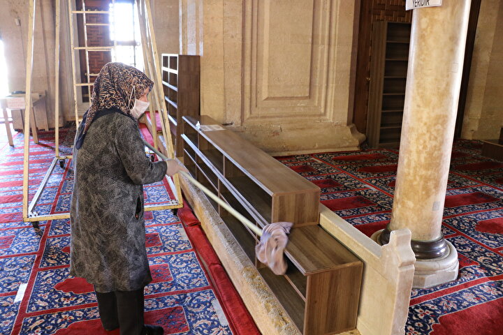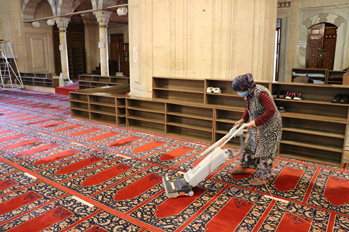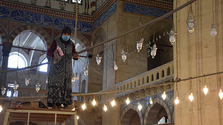 Ramazan ayı hazırlıkları kapsamında, cami çalışanları tarafından büyük bir titizlikle gül suyu ile silinen ampuller, tarihi cami içinde ziyaret edenler hoş bir koku ile karşılanıyor.