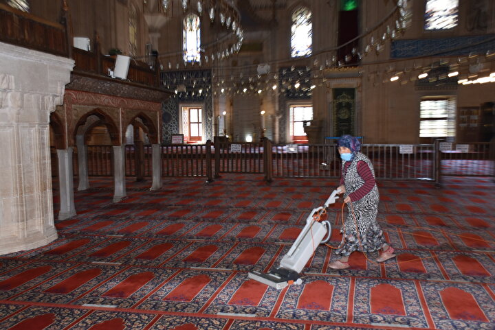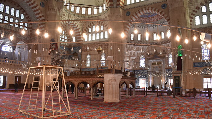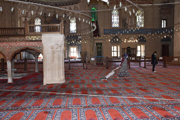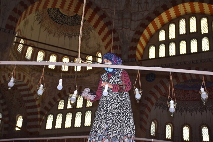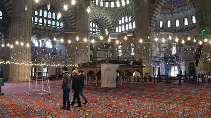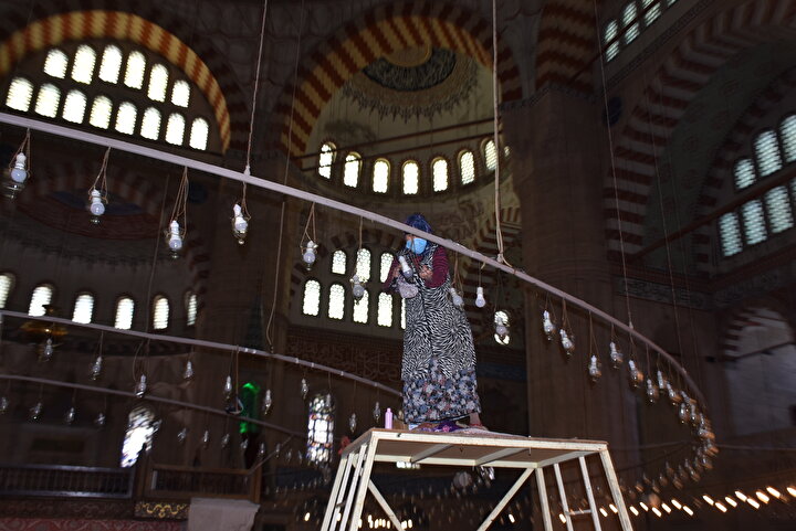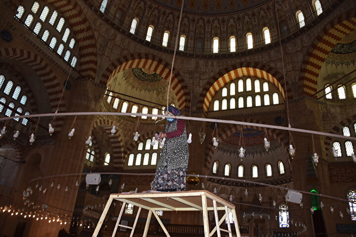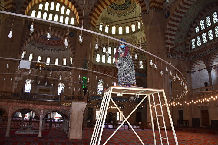 Edirne'de Mimar Sinan'ın ustalık eseri, tarihi Selimiye Cami, koronavirüs tedbirleri kapsamında ramazan ayına hazırlanıyor. Avizeleri gül suyuyla temizlenen, dezenfekte edilen camide sosyal mesafe yerleri belirlendi. Edirne İl Müftüsü Alaettin Bozkurt, "Camiye girildiğinde maskesi olmayanlara maske dağıtılıyor ve hemen dezenfektan sürülüyor. Camide namaz kılma yerlerimiz işaretlendi ve sosyal mesafeye dikkat edilecek şekilde camilerimiz hazır hale getirildi. Sadece burası değil tüm camilerimizde en az 1 metre arayla işaretler bırakıldı" dedi.