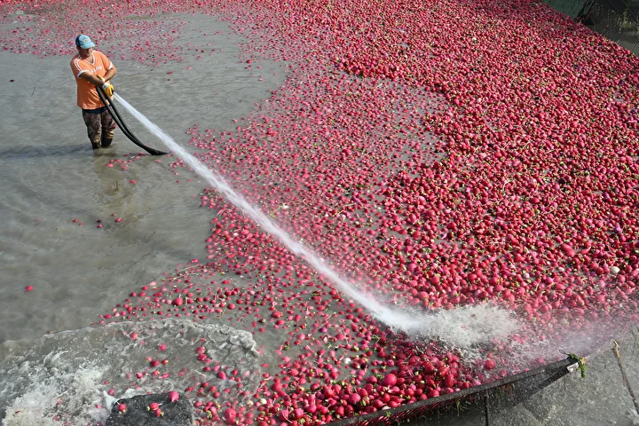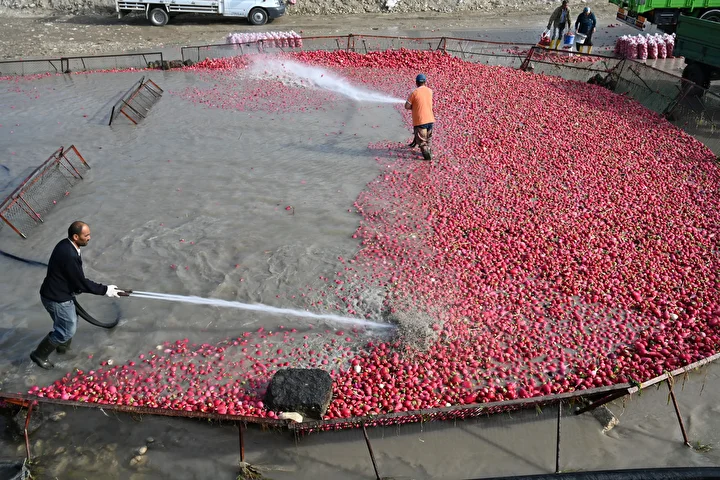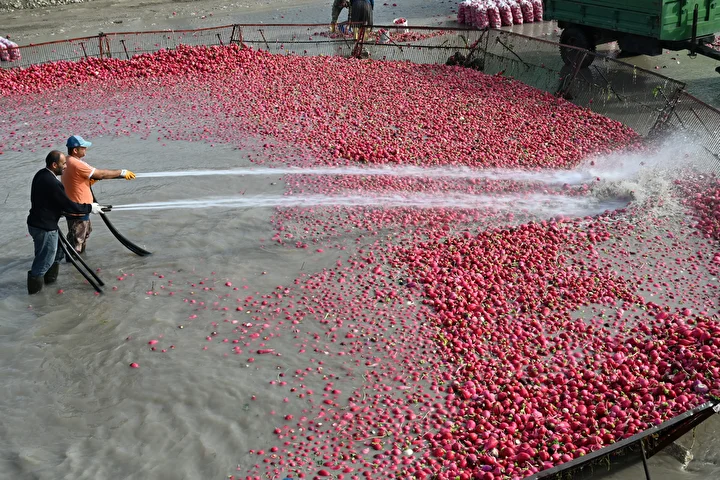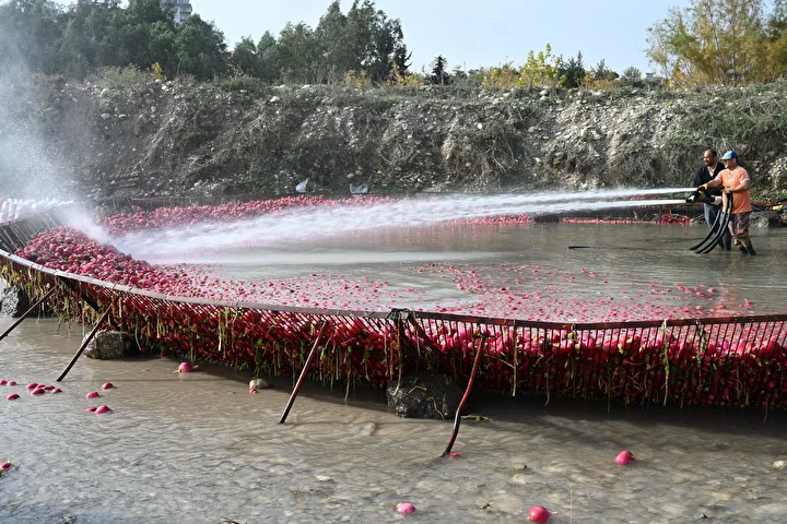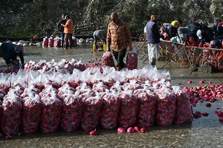 Yetiştirildiği ilçenin adıyla tescillenen kırmızı turplar, hasat edildikten sonra çamurdan arındırılması için Savrun Çayı'na taşınıyor.