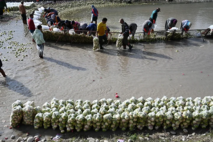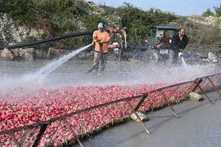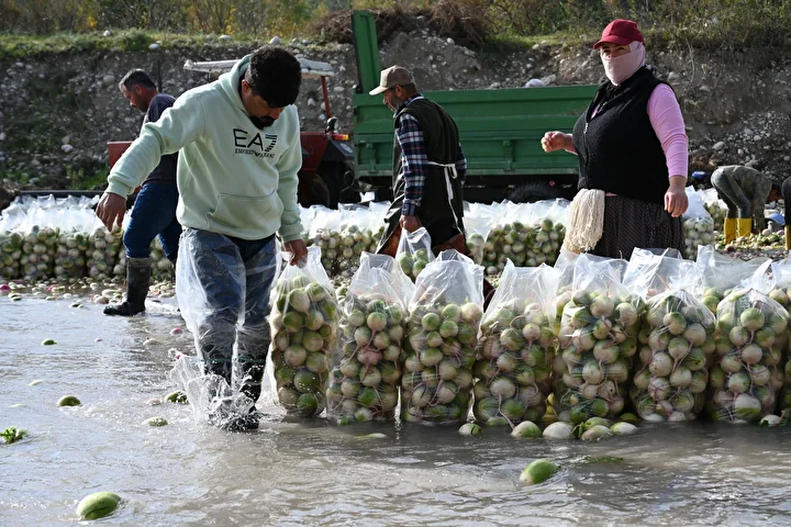 Osmaniye'de coğrafi işaret tescilli Kadirli turpunda hasada başlayan çiftçiler, tüketicilere ulaştıracakları ürünleri çamurdan arındırmak için Savrun Çayı'nın soğuk suyunda el birliğiyle çalışıyor.
