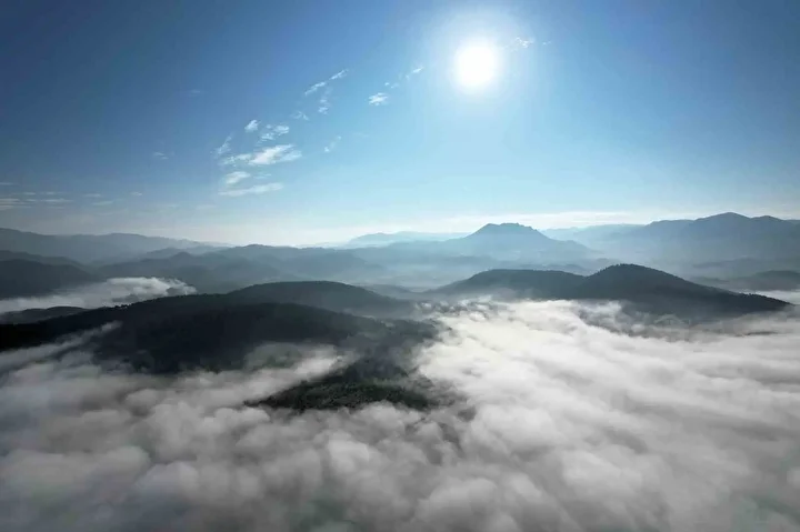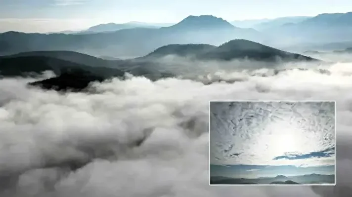 İlçeyi kaplayan beyaz örtü, havadan görüntülendi. Görüntülerde, sis bulutu ile kaplanan şehir merkezinden kırsal bölgelere uzanan manzara görsel bir şölen oluşturdu.