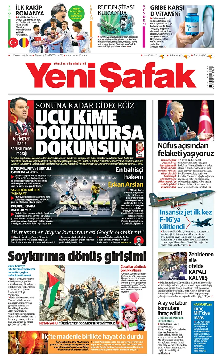 Yeni Şafak Gazetesi'nin 21 Kasım 2025 tarihli birinci sayfasında yer alan manşet ve haberler...