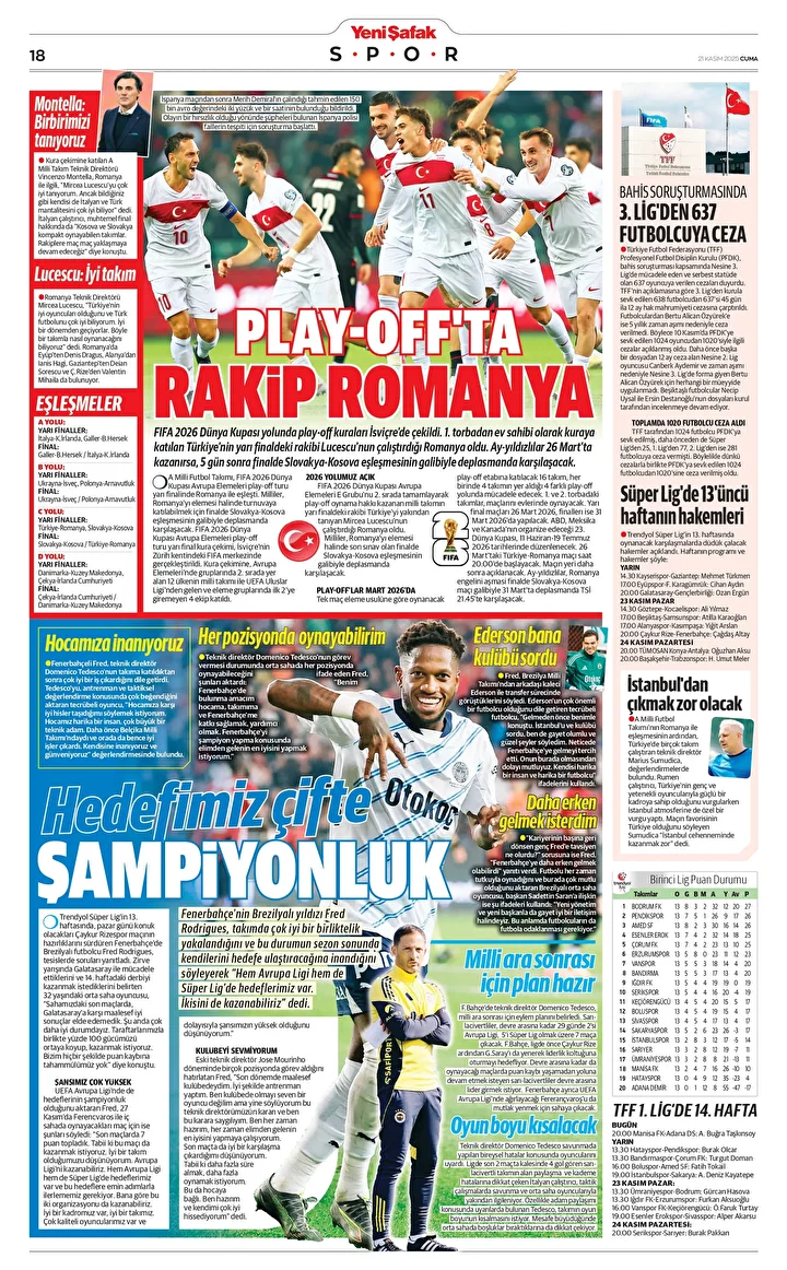 FIFA 2026 Dünya Kupası yolunda play-off kuraları İsviçre’de çekildi. 1. torbadan ev sahibi olarak kuraya katılan Türkiye’nin yarı finaldeki rakibi Lucescu'nun çalıştırdığı Romanya oldu. Ay-yıldızlılar 26 Mart’ta kazanırsa, 5 gün sonra finalde Slovakya-Kosova eşleşmesinin galibiyle deplasmanda karşılaşacak.