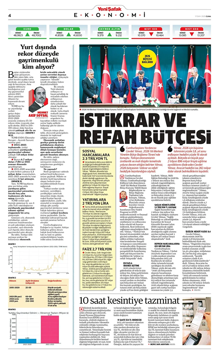 Cumhurbaşkanı Yardımcısı Cevdet Yılmaz, 2026 Yılı Merkezi Yönetim Bütçe Bağlama Töreni'nde konuştu. Bütçenin ‘istikrar ve refah’ hedefiyle hazırlandığını söyleyen Yılmaz, 2026 için büyüme tahminini yüzde 3,8, yıl sonu enflasyon hedefini yüzde 16 olarak açıkladı. Bütçenin yüzde 4,8'i sosyal yardım ve destekler için ayrıldı.