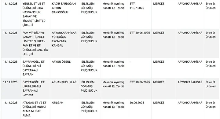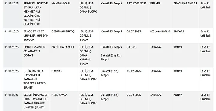 Denetimlerde, dana sucuğu olarak satışa sunulan bazı ürünlerde mekanik ayrılmış kanatlı eti ve sakatat (baş eti, kalp) tespit edildi.