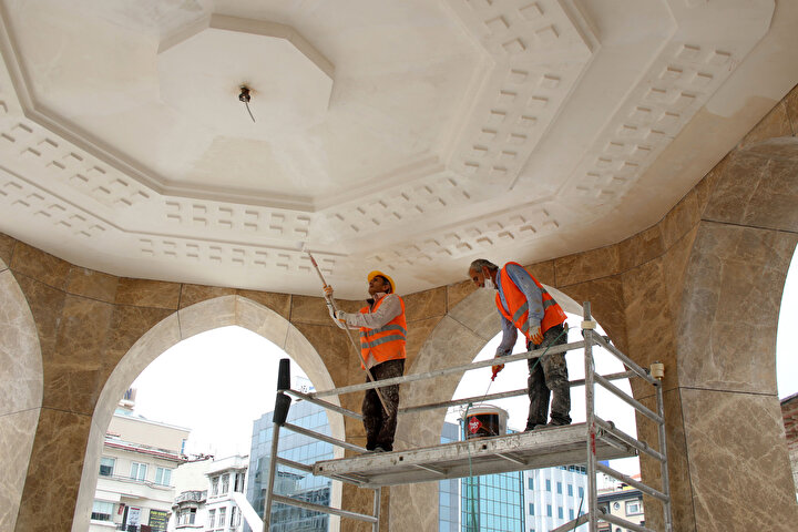 Dışarıdaki çalışmalar nedeniyle içeri giren tozlar, her gün temizlikçiler tarafından temizleniyor. Temizlikçilerin bir kısmı sütunları, bir kısmı ise ayakkabılıkları silerek tozdan arındırıyor.