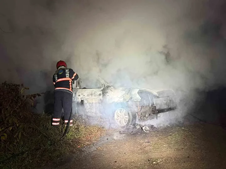 Sakarya’nın Akyazı ilçesinde tarladaki otomobilde çıkan yangın itfaiye ekipleri tarafından söndürüldü. Yanan otomobilden geriye ise sadece demir yığınları kaldı.