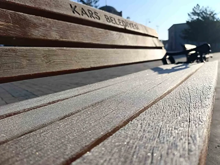 Kars’ta soğuktan caddelerdeki su birikintileri buz tutarken, park ve bahçelerde kırağı oluştu.