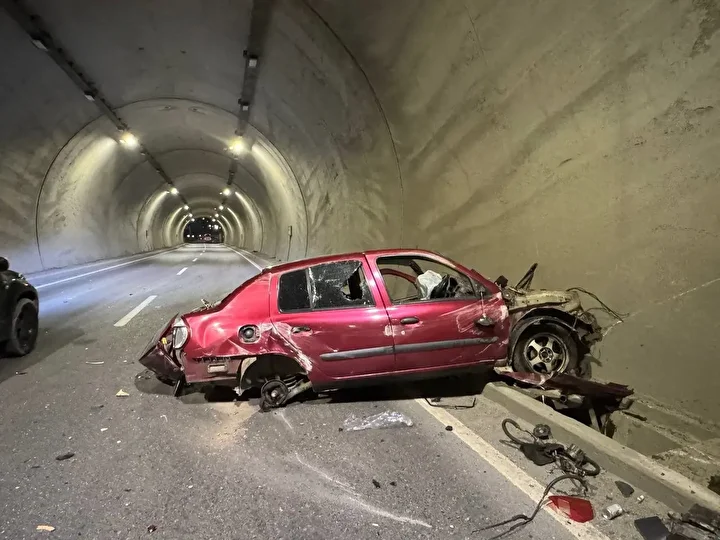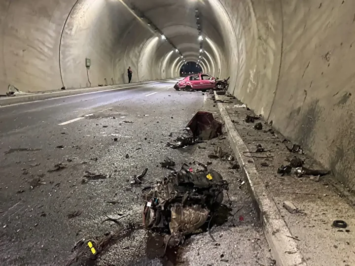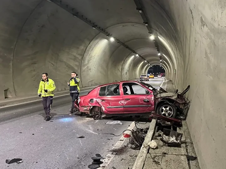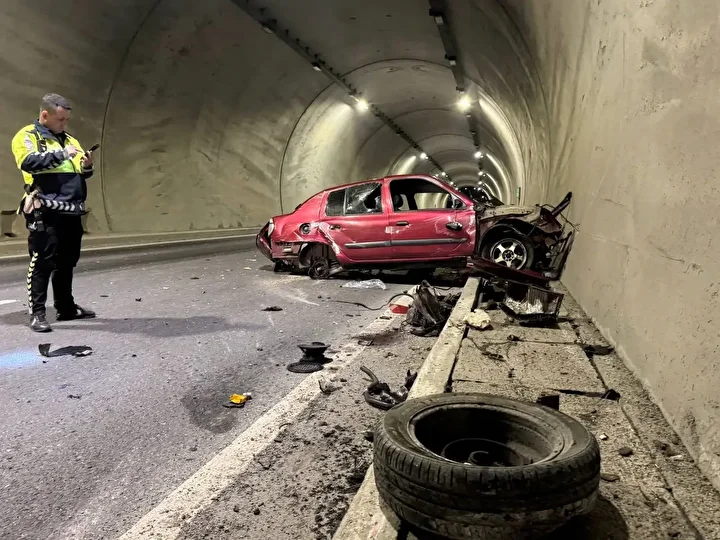Savrulan araç, tünelin duvarına şiddetli bir şekilde çarptı.