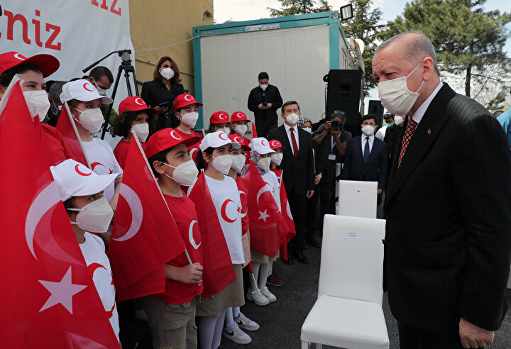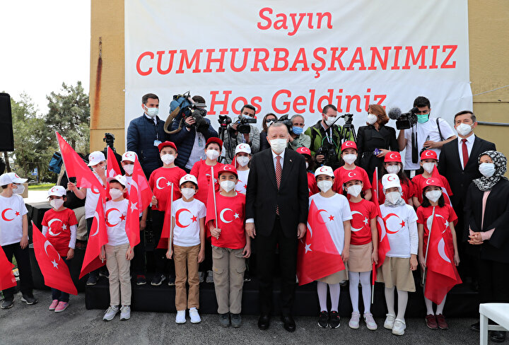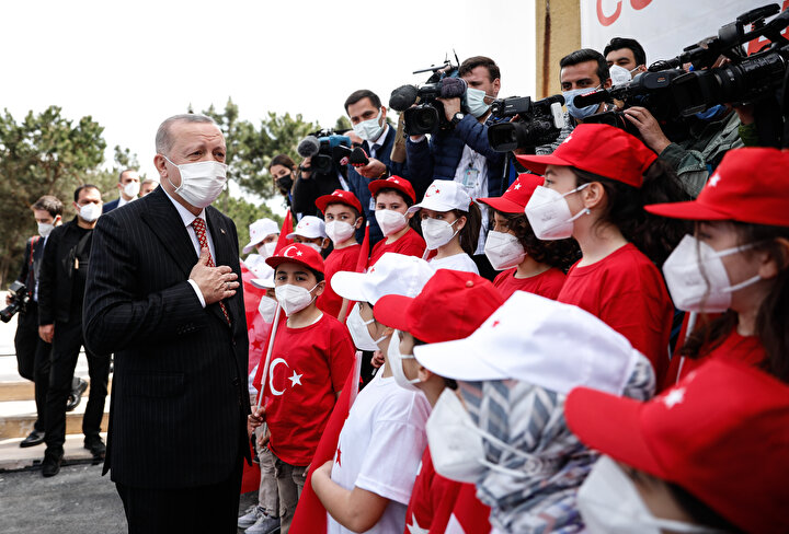 "Asla bu bayrağın dalgalandığı yerde hüzün keder olmayacak, kiminle? Bu yavrularımızla" diyen Erdoğan bayrak göndere çekildiği sırda çocuklarla birlikte İstiklal Marşı'nı okudu.