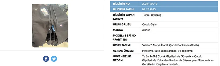 "Alkano" marka çocuk pantolonun beldeki ipi sorunlu bulundu. Kordon ve büzme iplerinin standarda aykırı olduğu belirtilirken, ürünün "yaralanma" riski taşıdığı belirtildi.