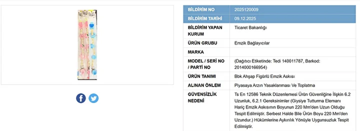 Yasaklama kararı verilen bir başka ürün ise bebeklere yönelik emzik bağlayıcı oldu. Tedi'de satılan emzik askısının boyunun uzun olduğu ve "boğulma" riski taşıdığı belirtildi.