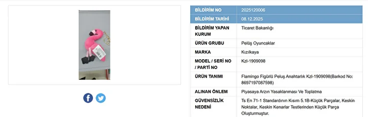 Piyasadan toplatılma kararı verilen bir diğer ürün ise pelüş oyuncak oldu. "Kızılkaya" marka "Flamingo Figürlü Pelüş Anahtarlık"ın "boğulma" riski taşıdığı duyuruldu.