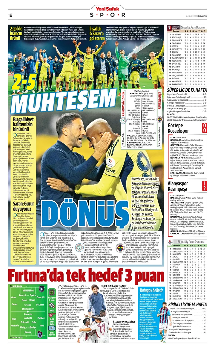 Fenerbahçe, zorlu Çaykur Rizespor deplasmanından galibiyetle dönerek zirve takibini sürdürdü. Maçın ilk yarısında Ali Sowe ve Laçi’nin golleriyle 2-0 geriye düşen sarılacivertliler, ikinci yarıda Asensio (2), Talisca, En-Nesyri ve Brown'ın golleriyle geri dönerek 3 puanın sahibi oldu.