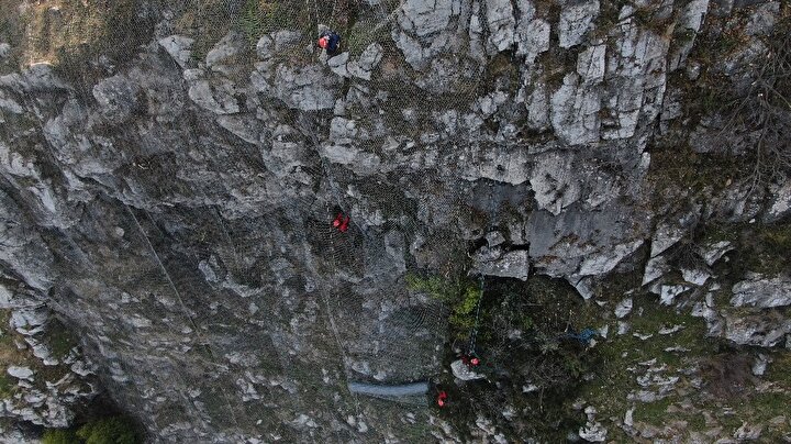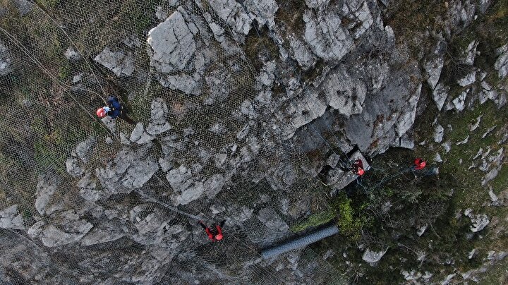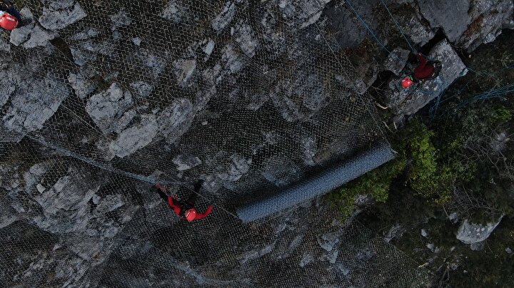 Belediyenin ihale ettiği işi alan firma çalışanı 10 kişilik dağcı grubu 250 kilo ağırlığında 50 metre genişlikte 4 metre boyunda çelik tel ruloları uçurumdan aşağıya iple sarkıtıp istasyonlar kurarak kayalara sarıyor.