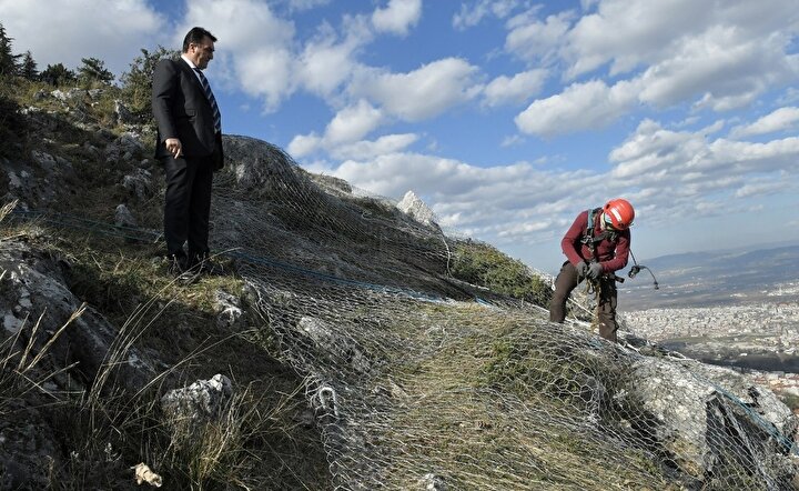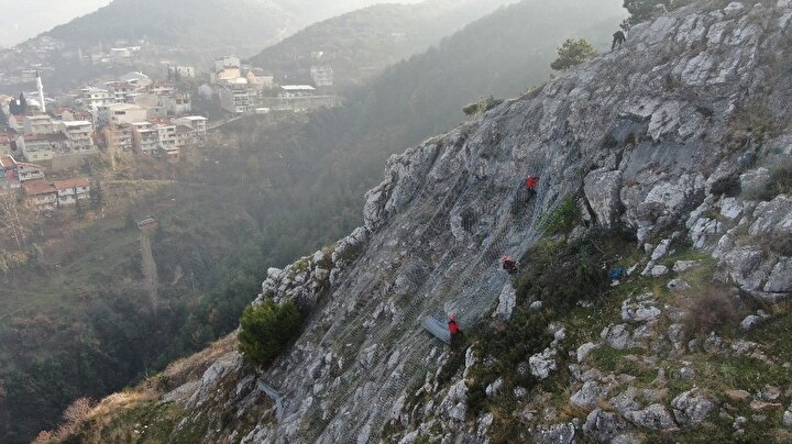 10 bin metrekarelik kayalık alanda tedbir aldıklarını belirten Osmangazi Belediye Başkanı Mustafa Dündar, "Altıgen çelik telle bu bölgeyi kaplıyoruz. Herhangi bir harekette taşların buradan kopması halinde bu tel kayaları engelleyip aşağıya vatandaşların evlerine gitmesine engel olacak. Dağ yamaçlarında yapılan bu çalışmayı dağcılar yapıyor. Herkesin yapabileceği bir iş değil. Bizler çelik tellerle bu bölgeyi sağlamlaştırıp kayaların aşağıya inmesini engelliyoruz" dedi.