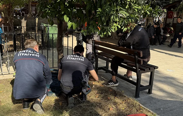 Antalya'da cami avlusunda uyurken sol bacağını banka sıkıştıran Erkan Seymen'i, itfaiye ekibi kurtardı.