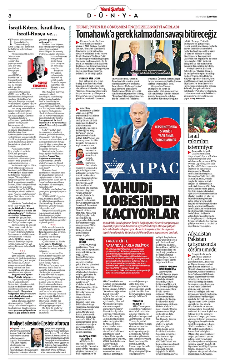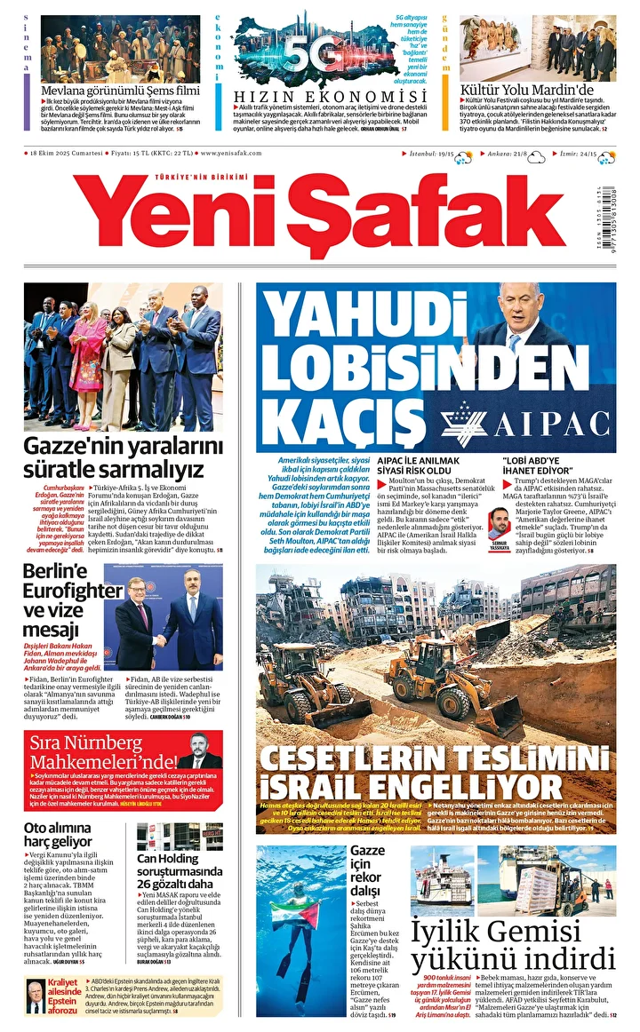 Yeni Şafak Gazetesi'nin 18 Ekim 2025 tarihli birinci sayfasında yer alan manşet ve haberler...