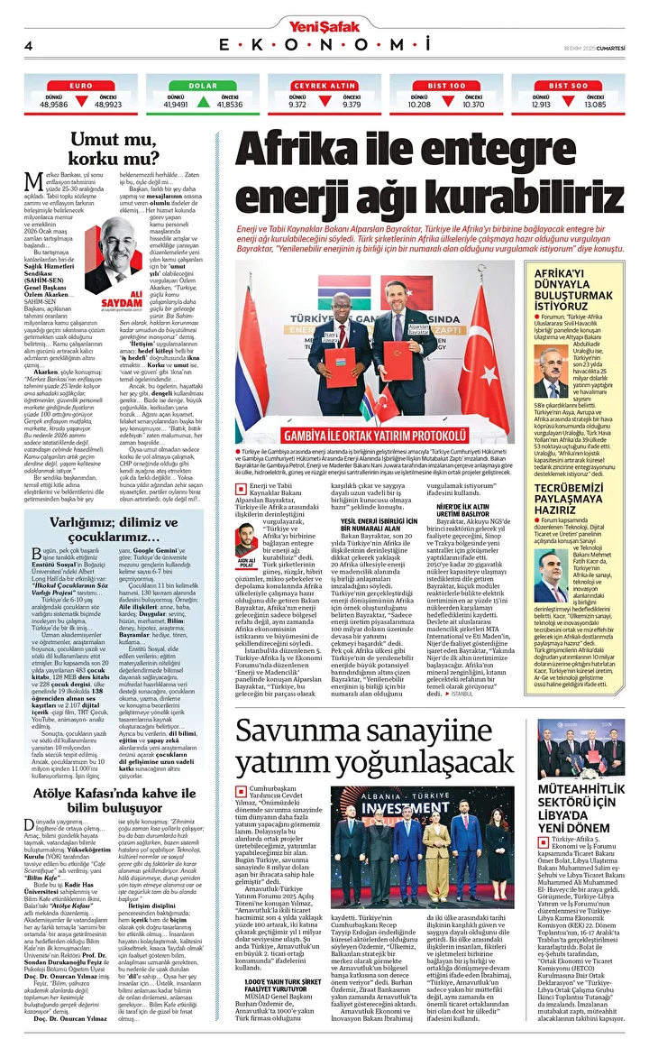 Enerji ve Tabii Kaynaklar Bakanı Alparslan Bayraktar, Türkiye ile Afrika’yı birbirine bağlayacak entegre bir enerji ağı kurulabileceğini söyledi. Türk şirketlerinin Afrika ülkeleriyle çalışmaya hazır olduğunu vurgulayan Bayraktar, “Yenilenebilir enerjinin iş birliği için bir numaralı alan olduğunu vurgulamak istiyorum” diye konuştu.