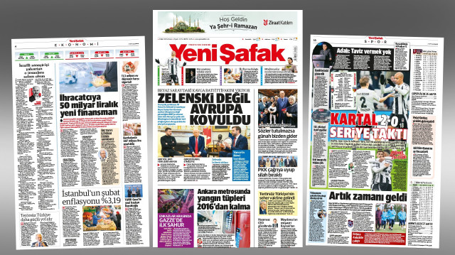 Yeni Şafak Gazetesi'nin 2 Mart 2025 tarihli birinci sayfasında yer alan manşet ve haberler...