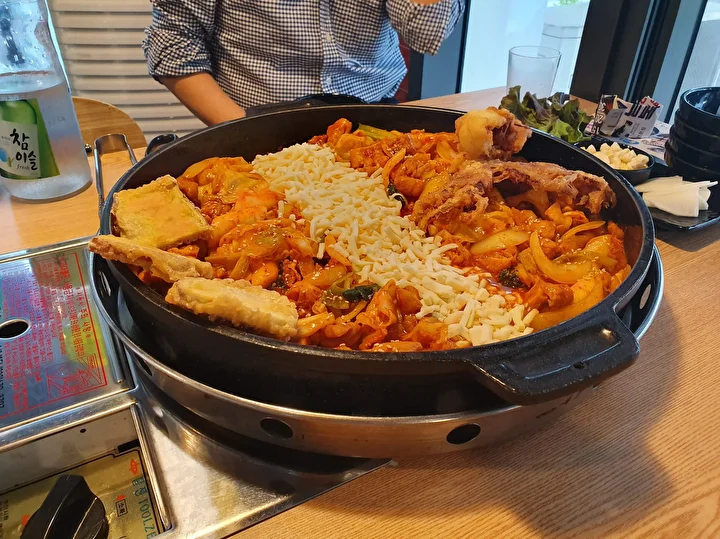Acılı gochujang sosuyla marine edilen tavuk parçalarının sebzelerle birlikte ızgara tavada pişirilmesiyle hazırlanan popüler sokak lezzeti.