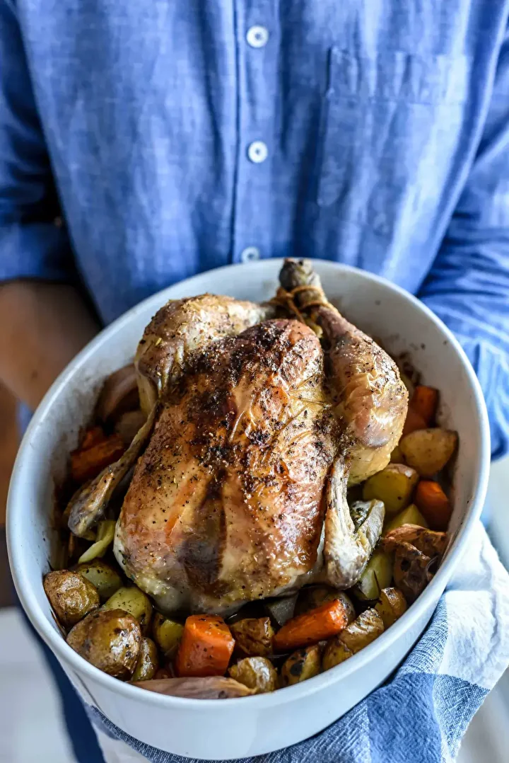 Klasik Fransız fırın tavuğu; tereyağı, otlar ve kök sebzelerle birlikte yavaş pişirilerek hazırlanıyor.