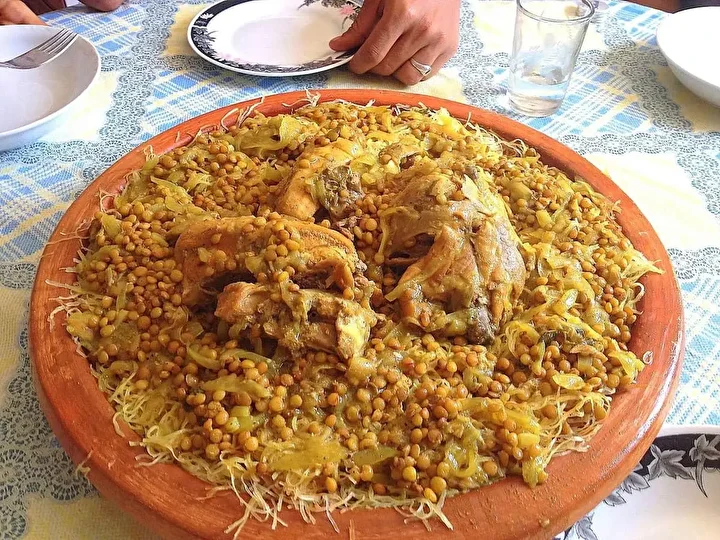 Tavuk, mercimek ve özel baharat karışımının ince yufkamsı msemen hamurları üzerinde servis edildiği geleneksel bir Fas yemeği.