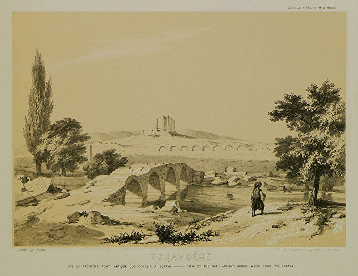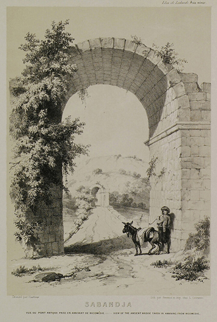 Justinian veya Sangarius Köprüsü'nün görünümü. Köprü, İznik'ten İzmit'e giden yol üzerinde, Adapazarı'nın dışındaki Sapanca gölünün yakınında, Sangarius (Sakarya) nehri üzerinde yer almakta.