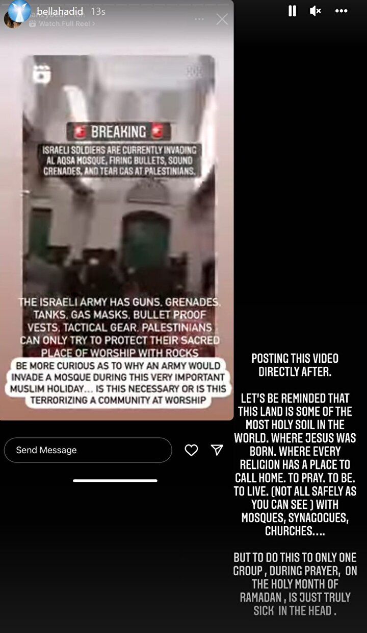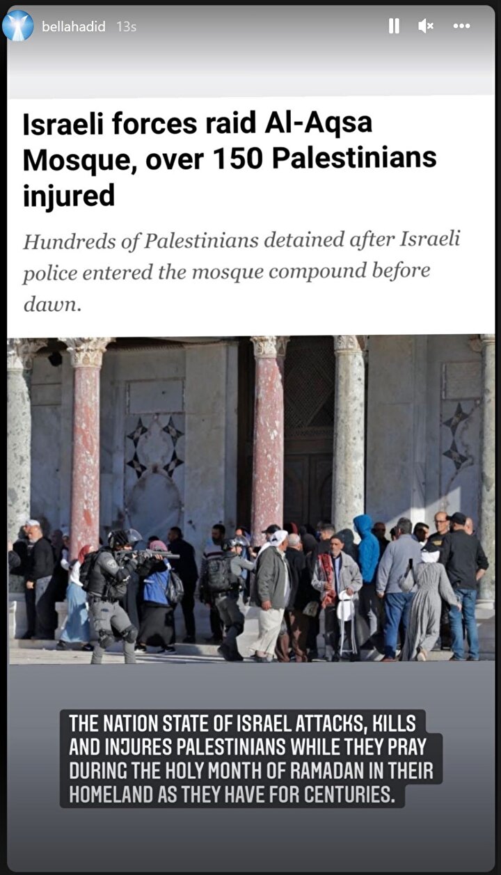 Yaşanan zulmü sosyal medya hesabından fotoğraf ve görsellerle duyuran dünyaca ünlü Filistin asıllı model Bella Hadid’in paylaşımları kısa sürede engellendi.