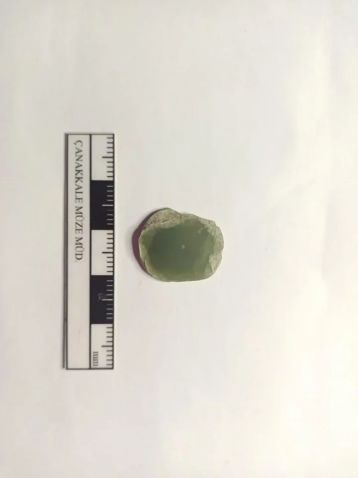 Aynı konteksten çıkan yeşim taşı, hazine buluntuları içinde son derece ender görülen bir örnek olarak öne çıkıyor. Muhtemelen yüzük taşı ya da süs eşyası işleviyle kullanıldığı düşünülen bu taş, 4500 yıl önce Troya’daki lüks tüketim ürünlerinden birinin parçasıydı.