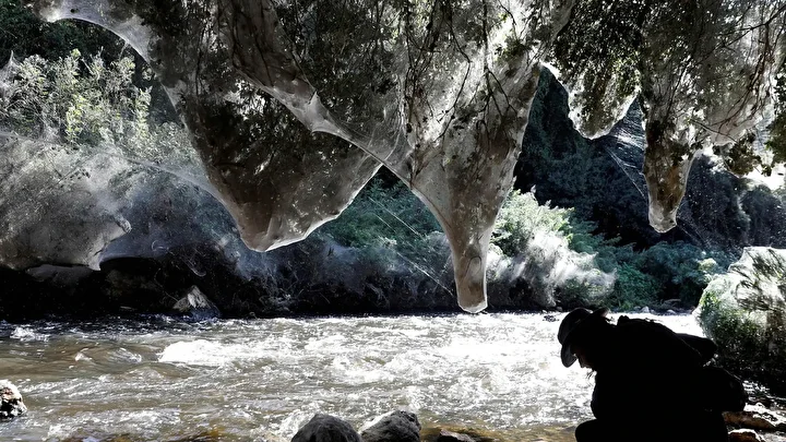 Devasa koloni, ipeksi bir çadır kent gibi binlerce ayrı huni ağından oluşuyordu ve ağ üzerinde araştırma yapan yazarlara göre muhtemelen dünyanın en büyük örümcek ağıydı.