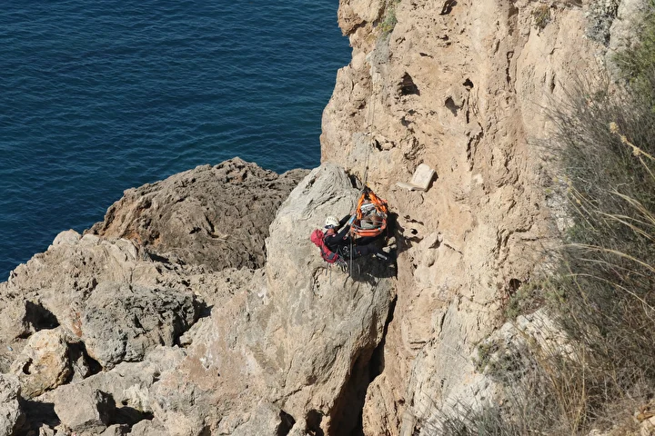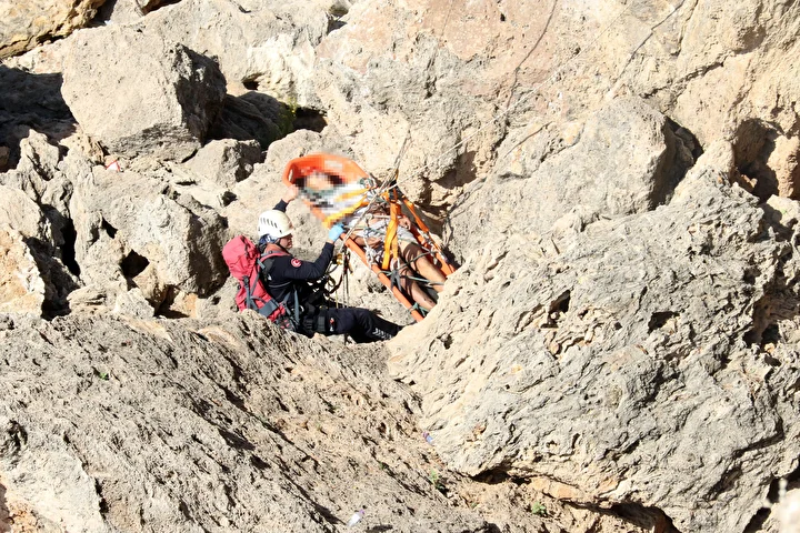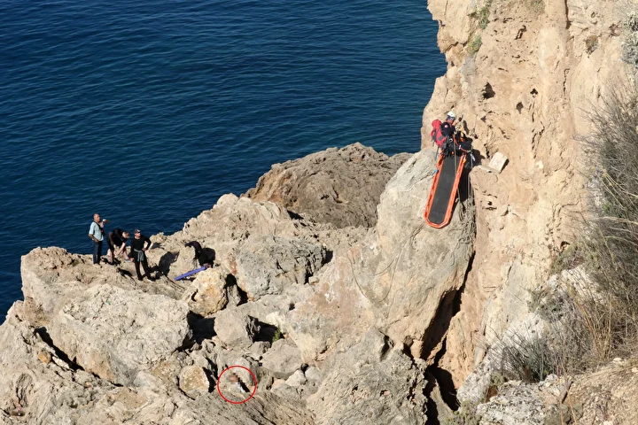 Deniz polisi, cesedi çıkaramayınca itfaiye ekipleri halatla 30 metrelik falezlerden indi. Sedyeyle inen itfaiye eri, cesedi kaşık sedyeye bağladı.