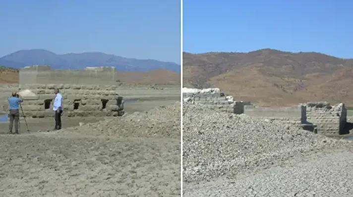 Kuraklık nedeniyle suların çekilmesinin ardından tarihi köprünün ayakları yeniden gün yüzüne çıktı.