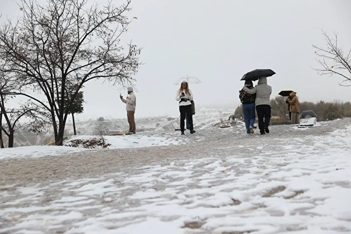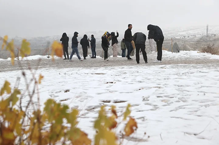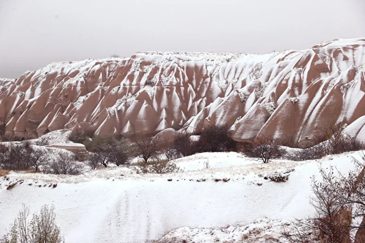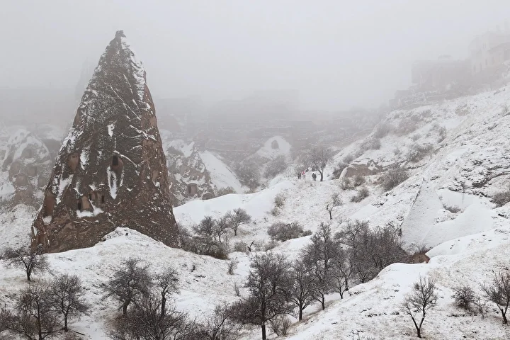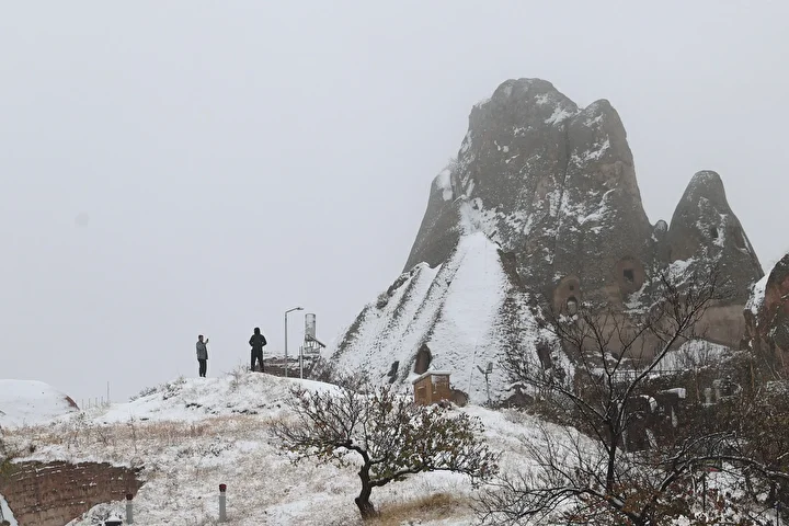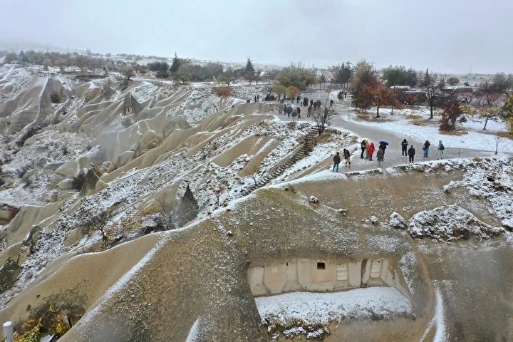 Türkiye'nin tarihi, kültürel ve doğal güzellikleriyle bezeli turizm bölgesi Kapadokya'da, mevsimin ilk karı peribacalarıyla kaplı vadilerde masalsı manzara oluşturdu. Bölgeyi ziyaret eden yerli ve yabancı turistler, karla kaplanan peribacaları ve doğal kaya oluşumları arasında gezinti yaptı.
