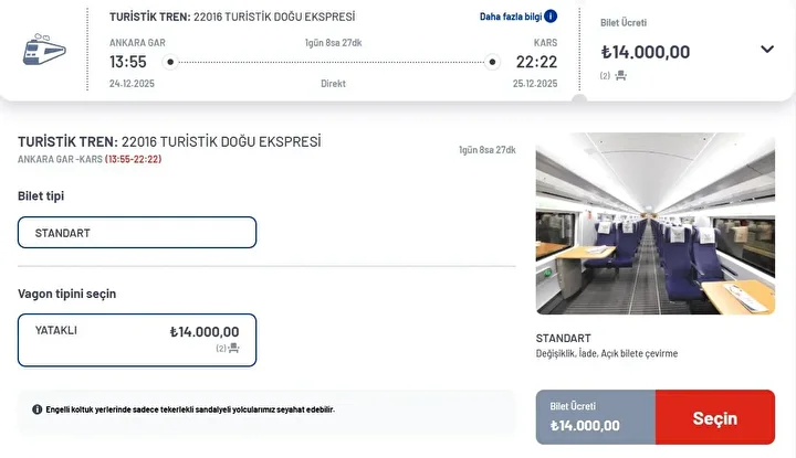 Biletlerin bugün (27 Ekim Pazartesi) satışa sunulmasıyla birlikte sezonun merakla beklenen fiyatları da belli oldu. TCDD'nin bilet satış ekranını kontrol eden yolcular, müsaitlik bulunan seferler için 2 kişilik yataklı kompartıman fiyatının 14 bin TL olarak belirlendiğini gördü. Yoğun talep nedeniyle kontenjanı tamamen dolan seferler için ise sistemde fiyat bilgisi görüntülenemiyor.