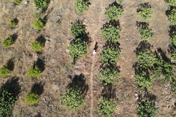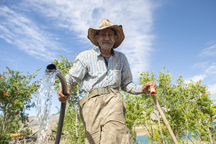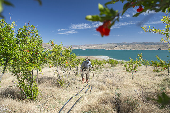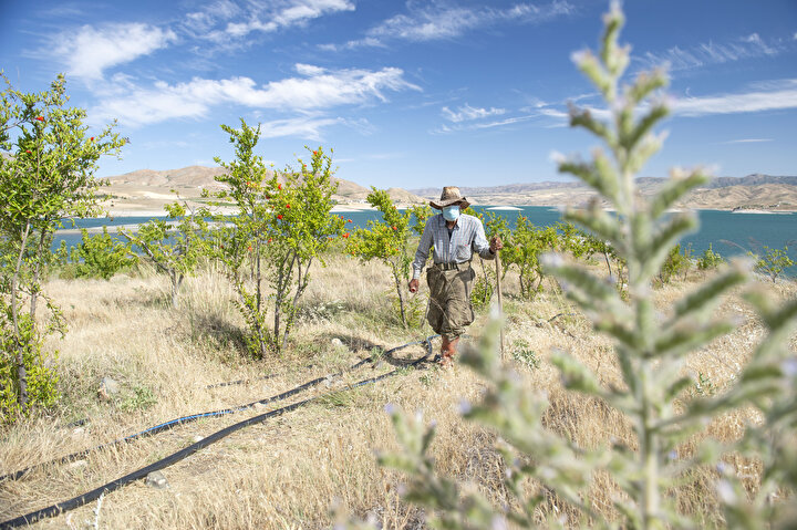İlerleyen yaşına rağmen çalışmaktan vazgeçmeyen Abay, 82 dönümlük ada üzerinde yetiştirdiği meyve ağaçlarını da su motoru yardımıyla ya da baraj gölünden kovayla taşıdığı suyla suluyor ve bu sayede yaz mevsiminde ağaçların kurumasını engellemeye çalışıyor.