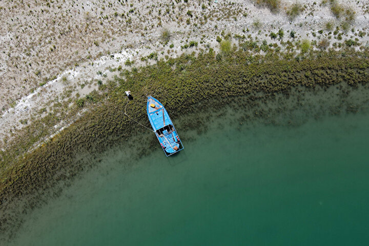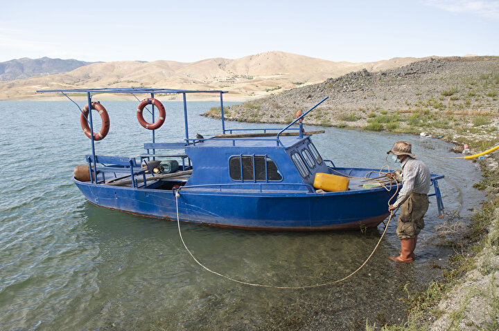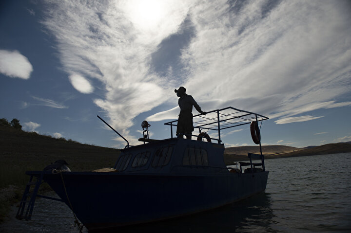 MAVI SULARIN ORTASINDA ADAYA KEYIFLI BIR YOLCULUK YAPIYOR Yaklaşık 3 kilometrelik bir yürüyüşün ardından evinden baraj gölü kıyısına ulaşan Abay, burada teknesiyle mavi suların ortasında ve martıların cıvıltısı eşliğinde adasına doğru dümen kırıyor.