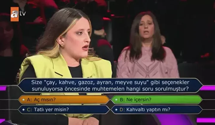 Ancak doğru cevap B şıkkı "Ne içersin?" olunca, yarışmacı büyük bir hayal kırıklığı yaşadı.