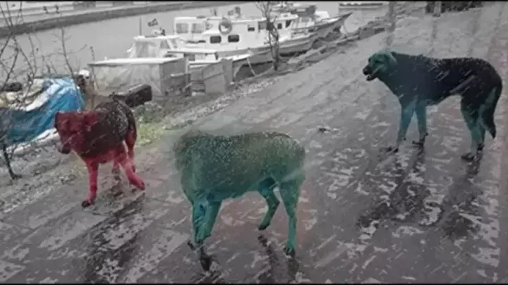 "İki ihtimali değerlendiriyorum. Köpeğin bir tanesi kahverengi-kızıla boyanmış gibi görünüyor. Muhtemelen yol asfaltlama ya da park çalışmaları sırasında kullanılan boyalı asfalt ya da zemine bulaşan boya türüne temas etmiş. O bölgeye girmiş veya yuvarlanmış ve bu madde vücudunun birçok noktasına temas etmiş. Diğer iki köpek ise mavi-yeşil tarzı bir renge boyanmış durumda. Onlar da muhtemelen boya içeren bir suyun içine girmişler. Bir süre bu suyun içinde kalınca boya hayvanların tüylerine geçmiş. Burada bilerek boyandığına dair bir kanıt yok. ’İnsan eliyle yapılmıştır’ demek doğru olmaz. Hayvanlar hareketli canlılardır; yerde yuvarlanmayı severler, farklı bir şey gördüklerinde ona ulaşmaya çalışırlar. Dolayısıyla böyle bir yaramazlık içinde olmuş olabilirler."