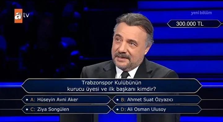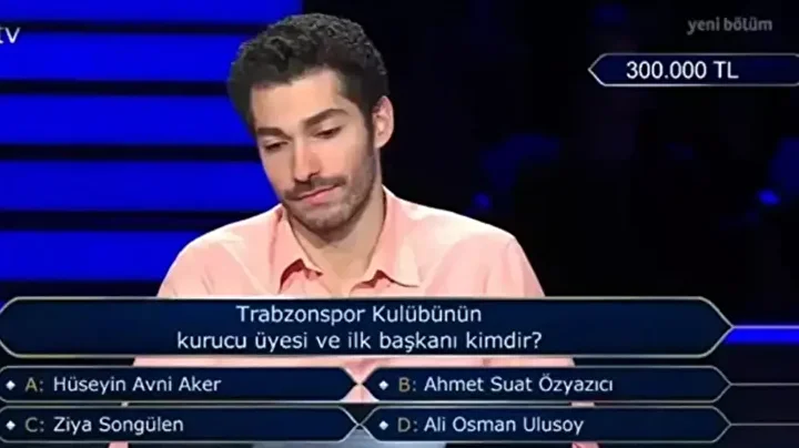 Trabzonspor Kulübünün kurucu üyesi ve ilk başkanı kimdir? sorusu ATV ekranlarında yayınlanan Kim Milyoner Olmak İster yarışmasında soruldu. Sorunun değeri ise tam tamına 300 bin TL.