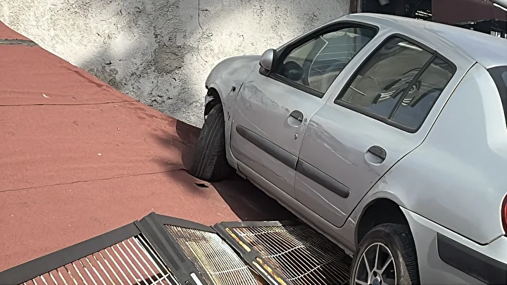 Savrulan otomobil, kaldırımdaki korkulukları aşıp yol seviyesinin altında kalan tek katlı evin çatısına çıktı.