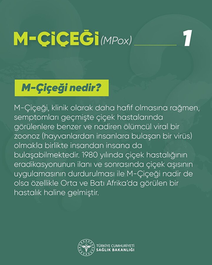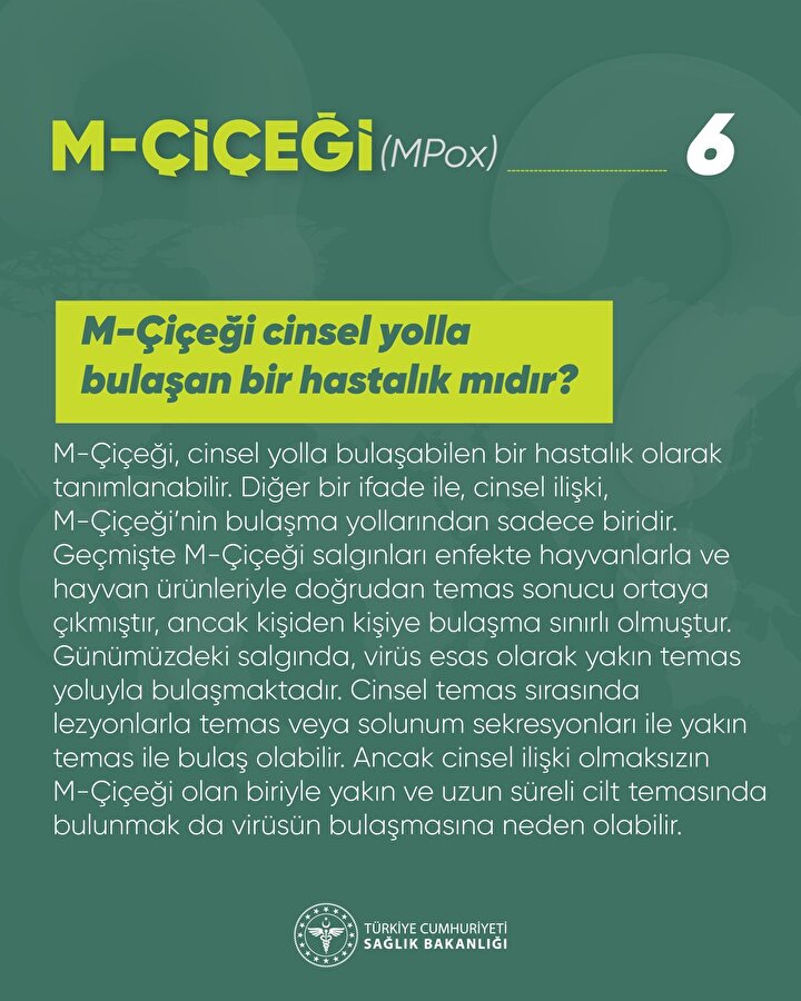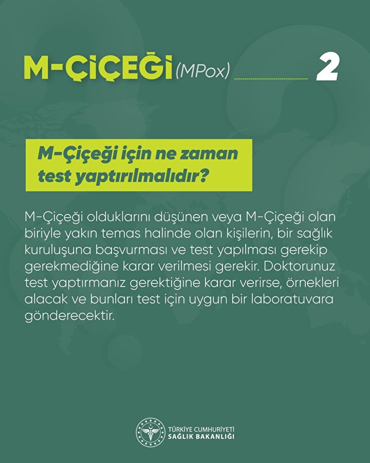 Sağlık Bakanlığı, Dünya Sağlık Örgütü'nün acil durum ilan ettiği Maymun Çiçeği (MPOX) ile ilgili sıkça sorulan sorular ve cevapları yayımladı. M-Çiçeği için ne zaman test yaptırılmalıdır?, M-Çiçeği belirtileri nelerdir?, M-Çiçeği nasıl bulaşır?, M-Çiçeği nasıl önlenebilir?, Evcil hayvanıma M-Çiçeği bulaşabilir mi?, M-Çiçeği su yoluyla havuzdan, sıcak küvetten veya su parkından bulaşabilir mi? İşte detaylar...